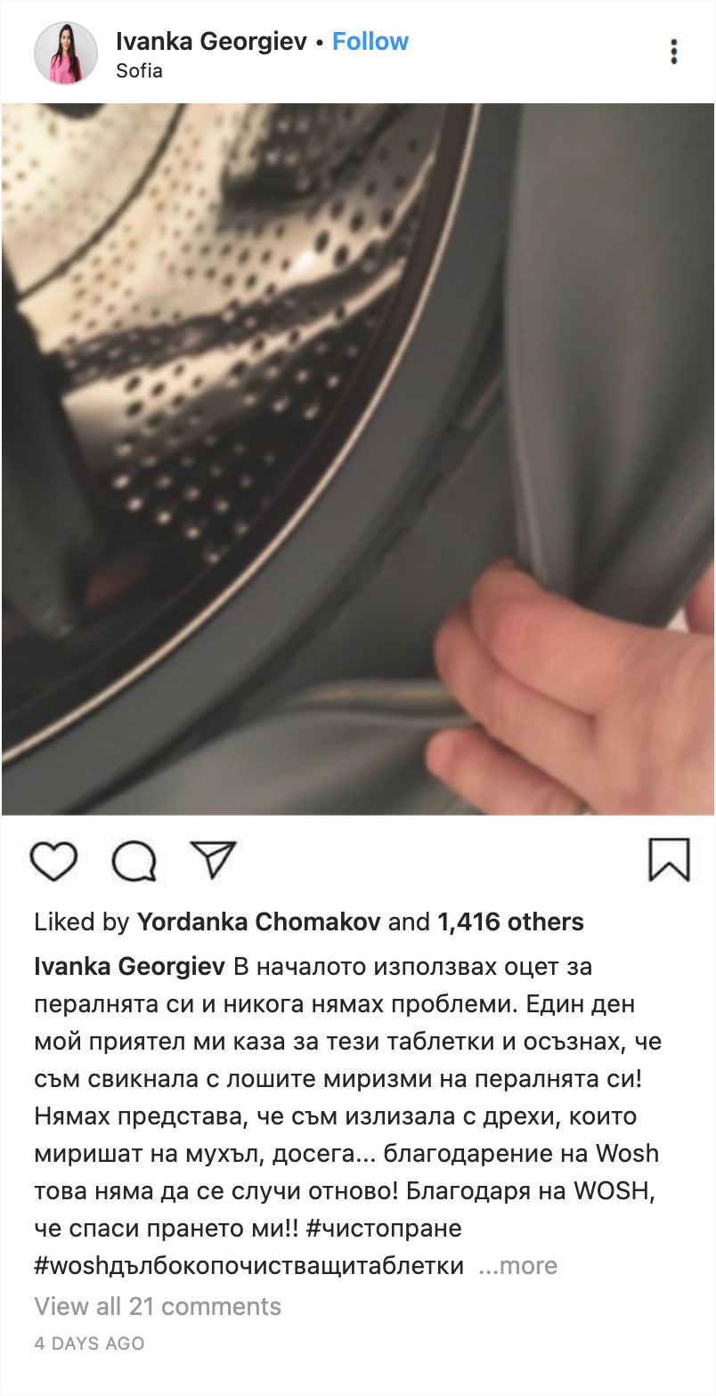 “Моята дъщеря ми купи първата опаковка. Винаги използвах само оцет, за да поддържам пералнята си чиста, но трябва да призная, че след като опитах Wosh, не можех дори да сравня резултатите!”